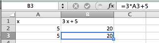 As with all new techniques in a math class, we start with a very simple example that you can easily solve by methods you learned in previous courses. Suppose we have the function \(f(x) = 3 x + 5\text{,}\) and I want to find the value of \(x\) where \(f(x) = 40\text{.}\) I start by setting up a worksheet with \(x\) and \(f(x)\) as columns. I also need to start with a guessed value, which can be any number. I will start by guessing a value of 5. (I will enter that value twice so we can see before and after.)