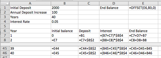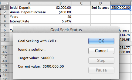 With Goal Seek it is easy to ask the question of how we need to change the problem to have a balance of $500,000 after 40 years, either by changing the initial deposit, or the rate at which deposits are increasing, or the expected yield. We see that we need a yield of 5.74% to have $500,000 ready for retirement.