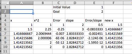 If we use the spreadsheet to illustrate Newton’s method for our example, finding the solution for \(x^2 = 2\) starting with a guess of \(x = 1\text{,}\) we see that it converges in 5 iterations. (At this point, we are simply illustrating how Goal Seek works. You are not yet expected to be able to replicate the process. You will learn how to find the slope of the tangent in later chapters.)
