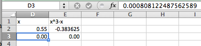 The first difficulty is that Goal Seek may not give you the answer you are looking for if there are multiple answers. The function \(f(x) = x^3 - x\) has three roots, \(x = -1, 0, 1\text{.}\) If we give Goal Seek a starting point of \(x=.55\text{,}\) it will give the solution of \(x=0\text{.}\)