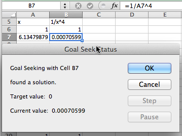 The more challenging case arises when there is no answer, but we get close. We can ask Goal Seek to find an x with \(1/x^4 = 0\text{.}\) Clearly this problem has no answer. However, if we start with a guess of \(x = 1\text{,}\) we get an answer of \(x = 6.14798\text{.}\) That is because \(1/6.14798^4\) is within our tolerance of 0. In both of these cases, we see that when we use Goal Seek we should also look at the graph of the function in question to make sure we are asking a reasonable question.