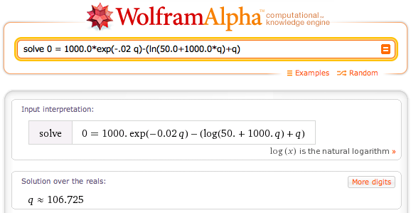 0 = 1000*\exp(-0.02*q) - (\ln(50 + 1000*q) + q)\text{,}
