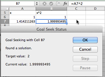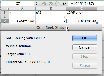 We move on to a quadratic example. We let \(f(x)=x^2\) and want to find \(f(x)=2\text{.}\) The set up is similar, with an appropriate change in the equation. However when I use Goal Seek, I don’t get quite the correct answer.