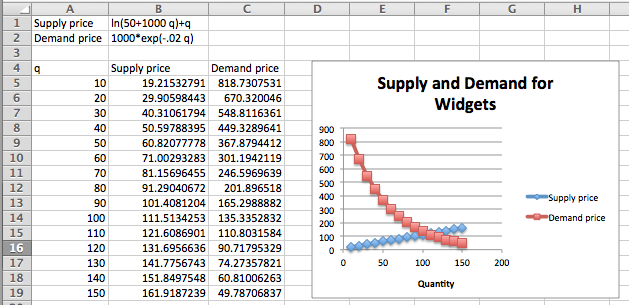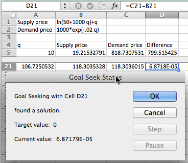 We can see that the curves cross when q is somewhere between 100 and 110. To make this a Goal Seek problem, we add an extra column for the difference between supply and demand, and look for where that is zero.