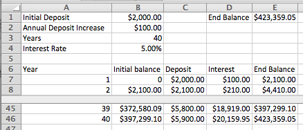 (We will look at this example in greater detail in a later chapter. For now, note that this example is in the Excel notebook for this section.) We can see that we have a bit more than $420,000 after 40 years.