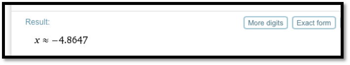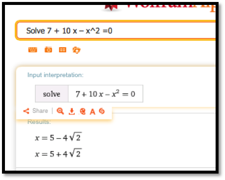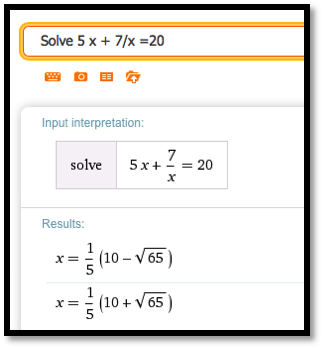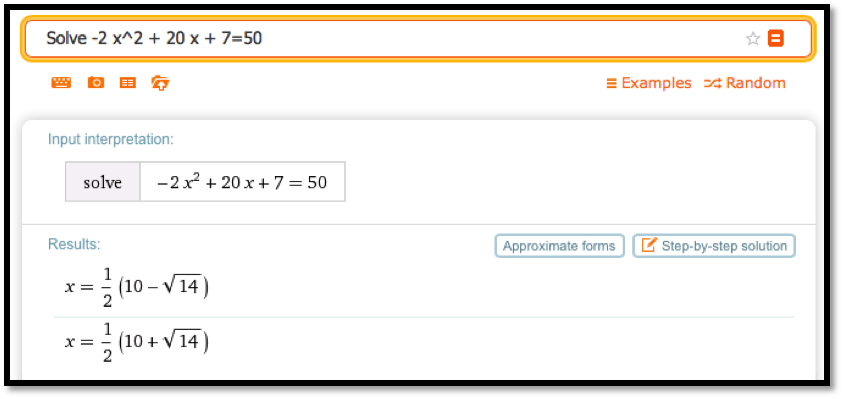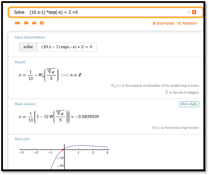 While Excel is a powerful tool, we should always ask if there is an easier way to do a problem. Most of the examples we looked at in this section boil down to finding a solution to \(f(x)=0\) where \(f(x)\) is a simple equation. We can solve such problems more quickly with Wolfram Alpha.