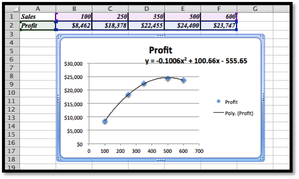 Using Excel we find the best fitting polynomial of order 2: