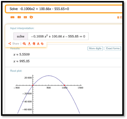 Using Wolfram we then find where the profit is 0. Using the approximate form of the solution is preferable in this case because we want to know at what Sales we have 0 profit (the break-even points).