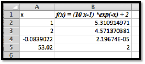 =(10*A2-1)*EXP(-A2)+2.In the screen grab the values of \(f\) for \(x = 1\) and \(x = 2\) are given, and below it the result for the GoalSeek procedure are given.
