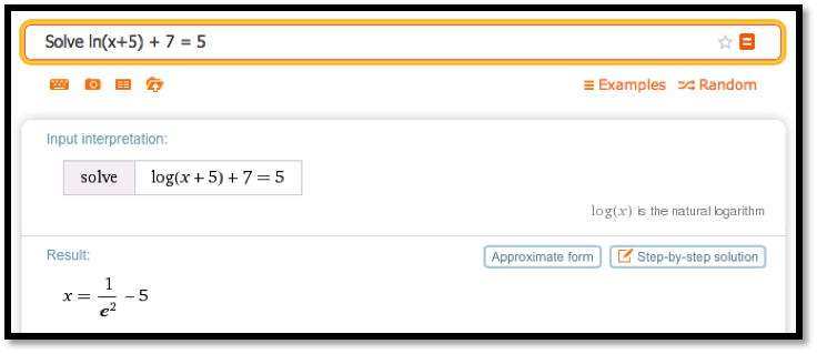 Let \(f(x) = \ln(x+5) + 7\text{.}\) Find an \(x\) so that \(f(x) = 5\text{.}\)