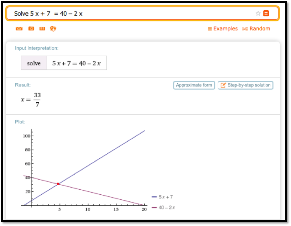 Wolfram tells us that \(x=\frac{33}{7}\text{.}\) We can plug that into one of the equations and get
