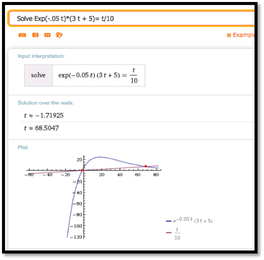 Find an intersection point of \(f(t) = \exp(-0.05 t)*(3 t + 5)\) and \(g(t) = t/10\text{.}\)
