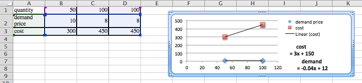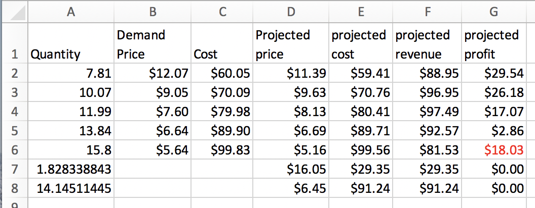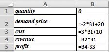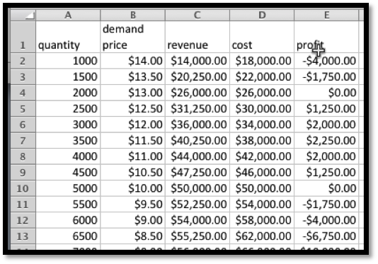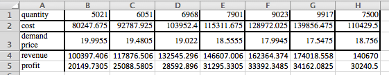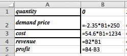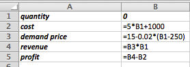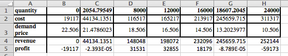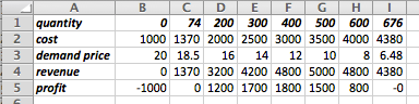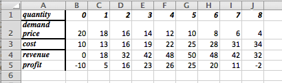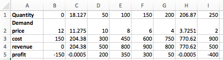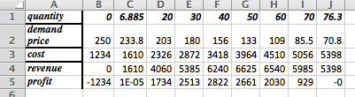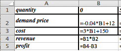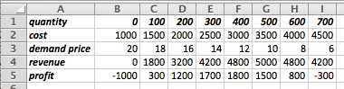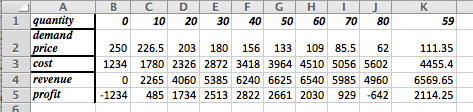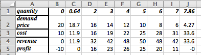 Given the demand price and the cost we create a table using the formulas and we also include a row for the \(\revenue =( \Dprice * \quantity)\) and \(\profit =(\revenue - \cost)\)