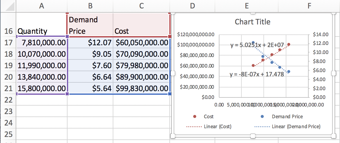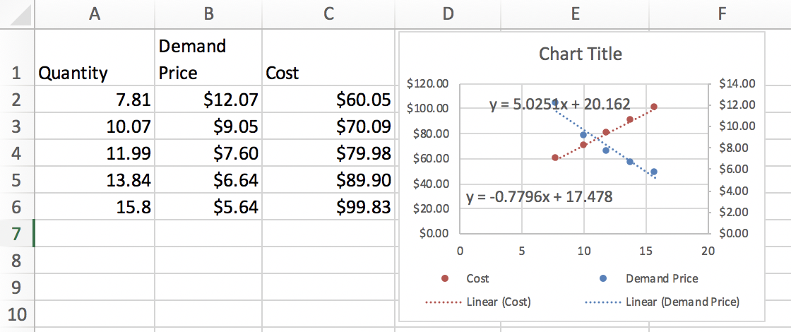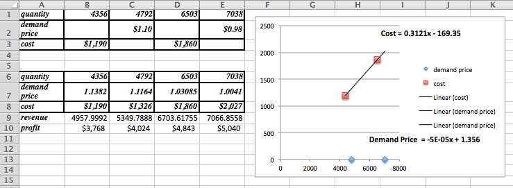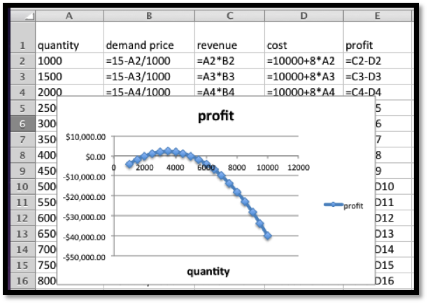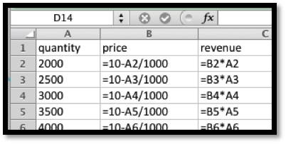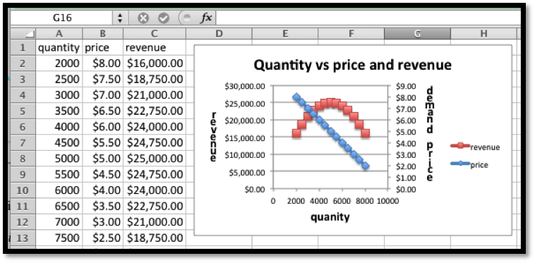 We set up a chart in Excel with revenue defined as \(\Sprice * \quantity\text{.}\)