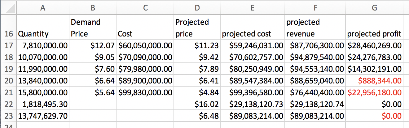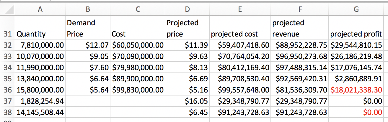 We enter these functions in new columns in the spreadsheet and then compute projective revenues and profit. We then use Goal Seek to find places where the projected profit is 0. The first break-even point goes from 1.83 million at price of $16.05 to 1.82 million at a price of $1602. The second break even point goes from 14.15 million units at a price to $6.45 to 13.75 million at a price of $6.48.