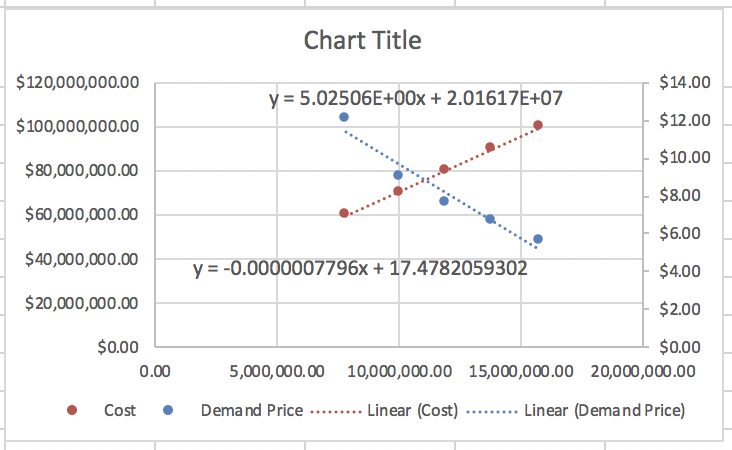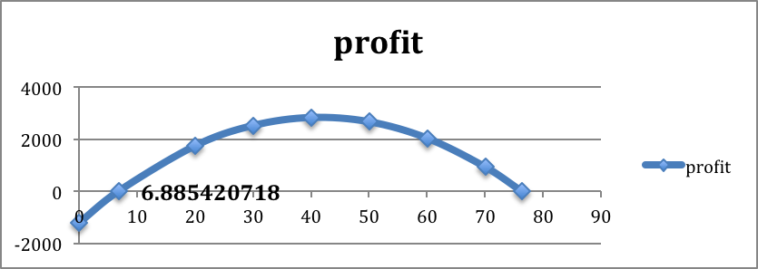 The graph produced in Excel. To create the labels: double click on one of the break-even points, go to “Chart Layout”, go to “Data Labels”. In this example we chose the “x-value”. Both break-even points were labeled to show where they are and what the values are in this problem.