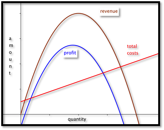 For our simple examples where cost is linear and revenue is quadratic, we expect the profit function to also be quadratic, and facing down. We will obviously be interested in the spots where the profit function either crosses the axis or reaches a maximum.