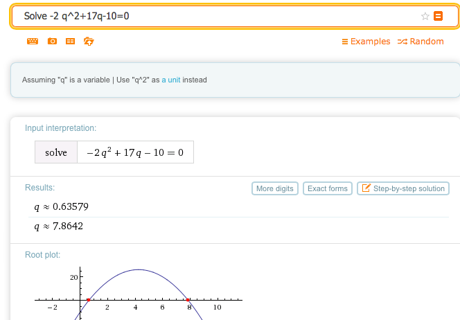 Solve \(\profit=-2 q^2+17q-10=0\text{.}\) We can do this with Excel or with Wolfram. The break even points are \(q = 0.6\) and \(q = 7.9\text{.}\)