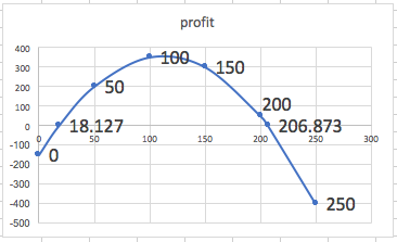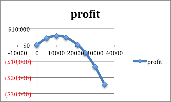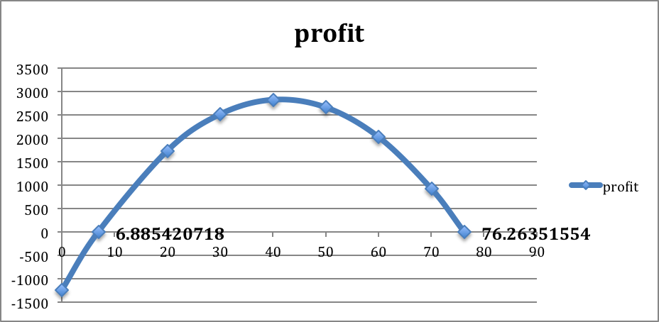 The profit function shows the break-even points close to 0 (-161) and near 20,000 (21,039)