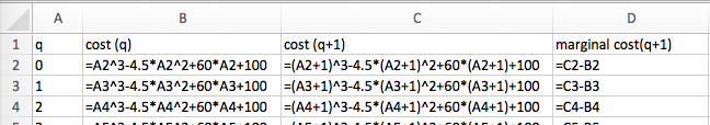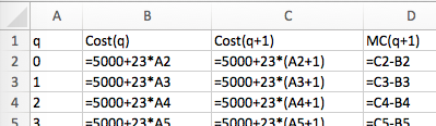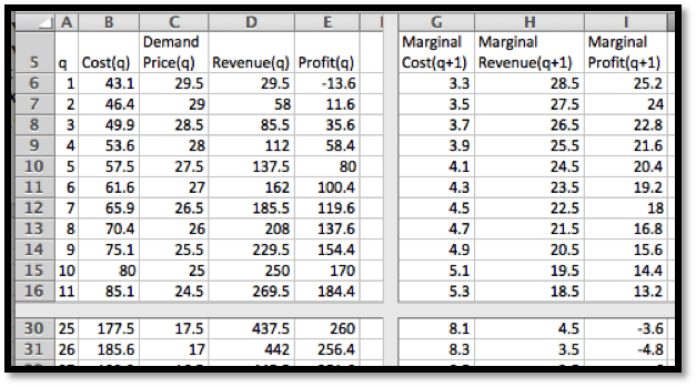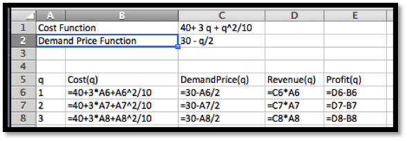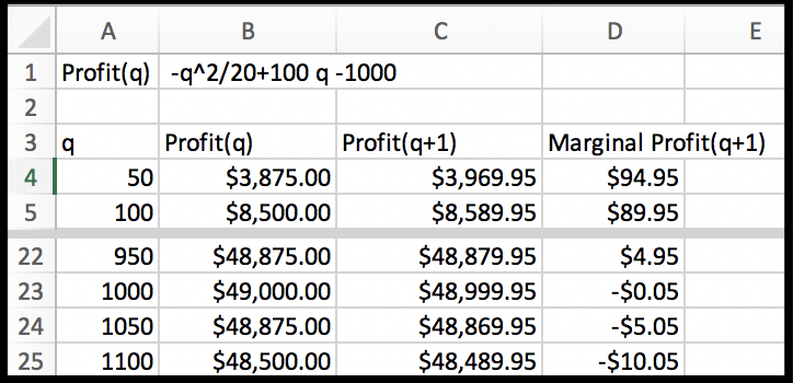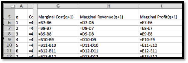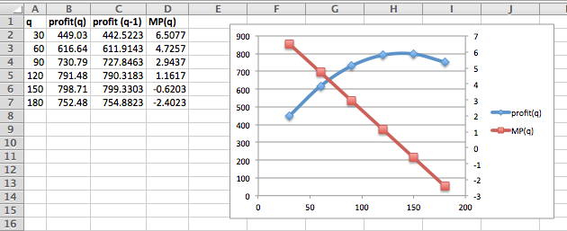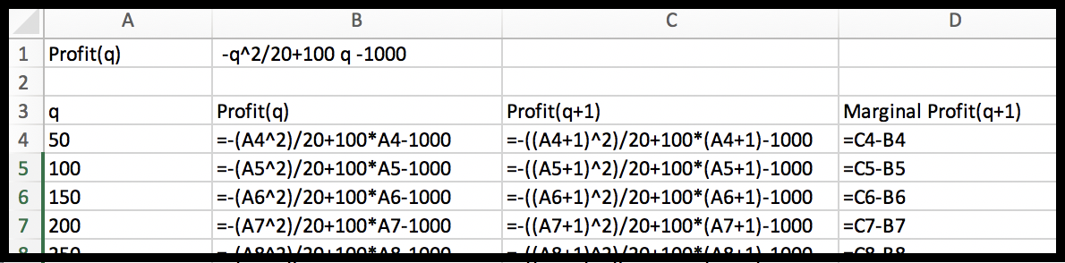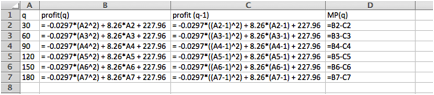 If \(\Mprofit(x+1)=\profit(x+1)-\profit(x)\text{,}\) then you can set this up in Excel by finding: \(q, \profit (q), \profit(q-1)\) and \(\Mprofit (q)\text{.}\)