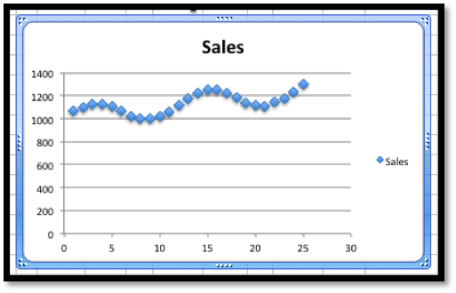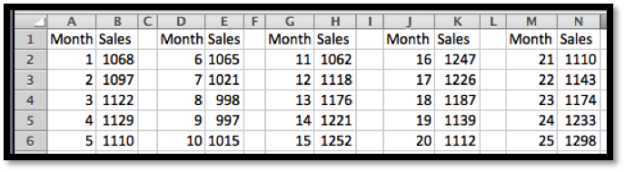 I can see that sales are trending upwards, but there is a seasonal variation added in. Excel will not do a good job of modeling this function with a trendline. Thus, I want to find a rate of change over a period of 12 months to eliminate the seasonal variation. To find the most recent trend I use the most recent data with a time period of 12 months.