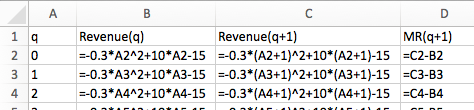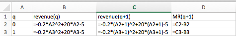 One solution is to add an extra column for \(q+1\) next to the column for \(q\text{.}\) Then the formula for \(\revenue(q+1)\) is obtained by quick filling form the formula for \(\revenue(q)\text{.}\)