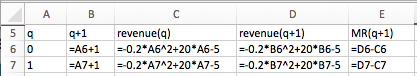 Suppose my revenue function is \(\revenue(q)=-0.2q^2+20q-5\) and I want to compute marginal revenue. Then \(\revenue(q+1)=-0.2(q+1)^2+20(q+1)-5\text{.}\) Experience shows that students will often make a typing mistake in the second formula, often forgetting parentheses somewhere or forgetting to change one of the copies of \(q\) to \(q+1\text{.}\)