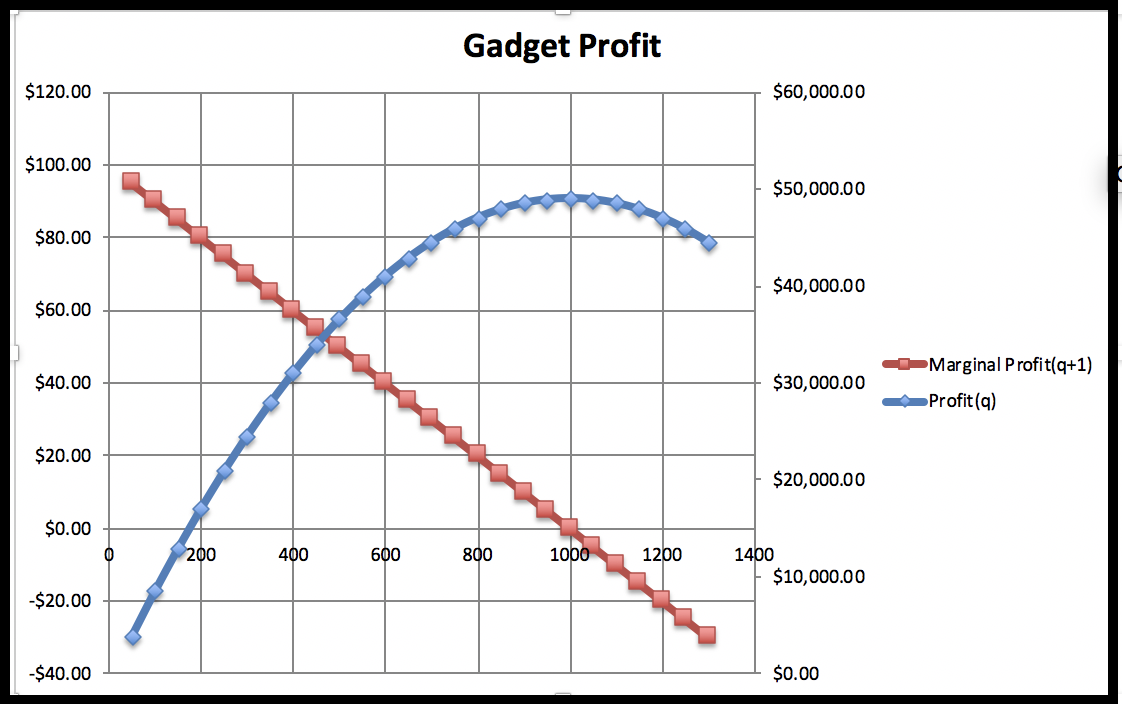 We see that profit reaches a maximum where marginal profit is zero. This occurs approximately when q is approximately 1000. In that case the profit is about $50,000. Looking back at the numbers in the spreadsheet, we see that the maximum profit is closer to $49,000.
