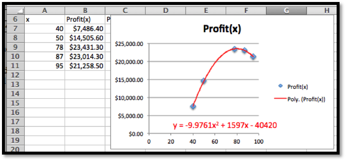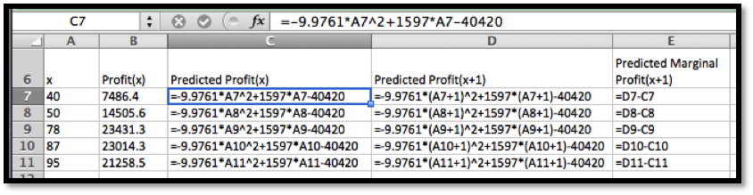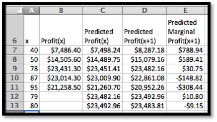 With the formula from the trendline, I can add a column for \(\Pprofit(x)\text{.}\) The obvious adjustment produces \(\Pprofit(x+1)\text{.}\) It is then easy to compute the value of \(\Mprofit(x+1)\text{.}\)