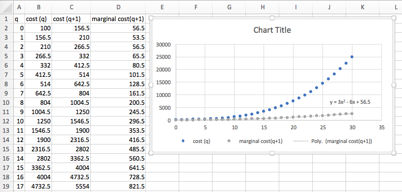 Make a chart of the function and the marginal function as q goes from 0 to 30.