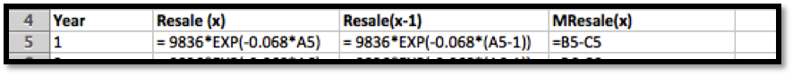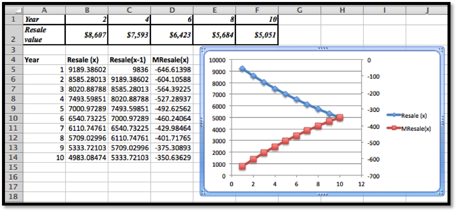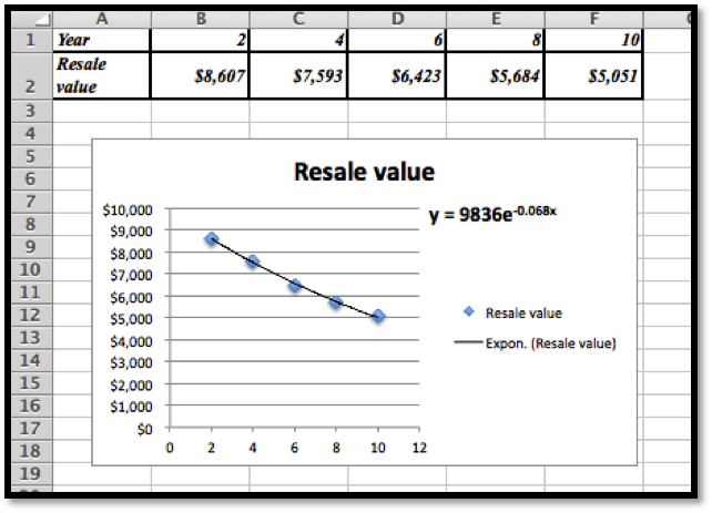 Assume \(\operatorname{Resale Value}(q)\) is an exponential function and that you have the following data: