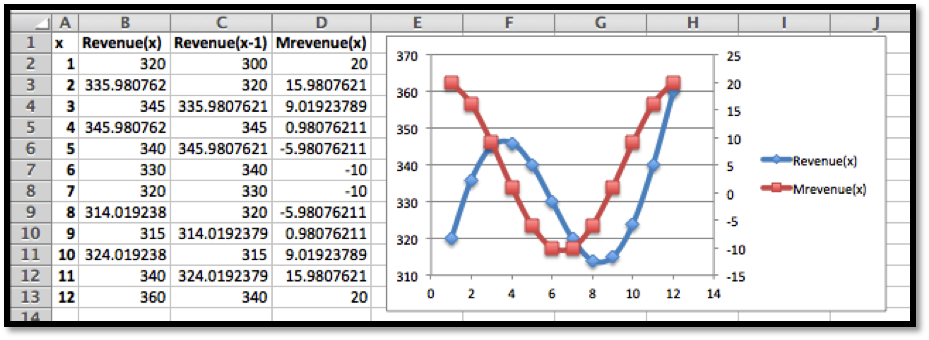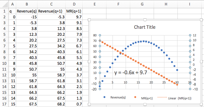 Recall that \(\Mrev(q+1)=\revenue(q+1)-\revenue(q)\)