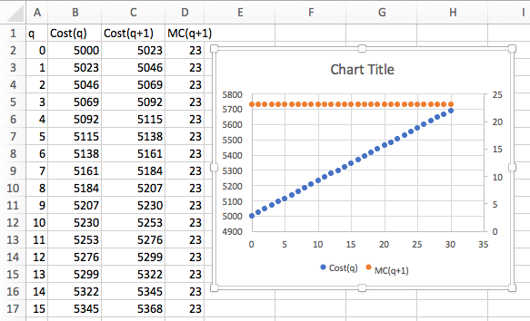 \(\Mcost(q+1)=\cost(q+1)-\cost(q)\text{,}\) but the cost function is equal to some constant, so \(cost(q+1)=cost(q)\text{.}\) This implies that the Marginal Cost function must be 0.