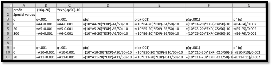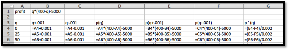 We want to set up the problem to be able to graph the profit function and its derivative on the same graph. We will us the calculator approximation of the derivative. As we did in the last section, we set up a worksheet with columns for \(q\text{,}\)\(q+.001\text{,}\)\(q-0.001\text{,}\)\(p(q)\text{,}\)\(p(q+.001)\text{,}\)\(p(q-0.001)\text{,}\) and \(p'(q)\text{.}\) This allows most of the worksheet to be filled in with quick fill.