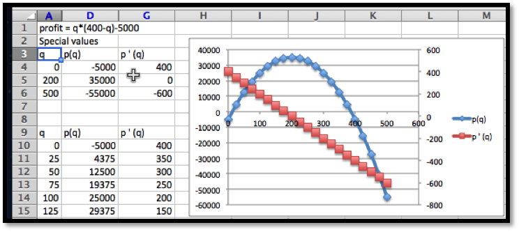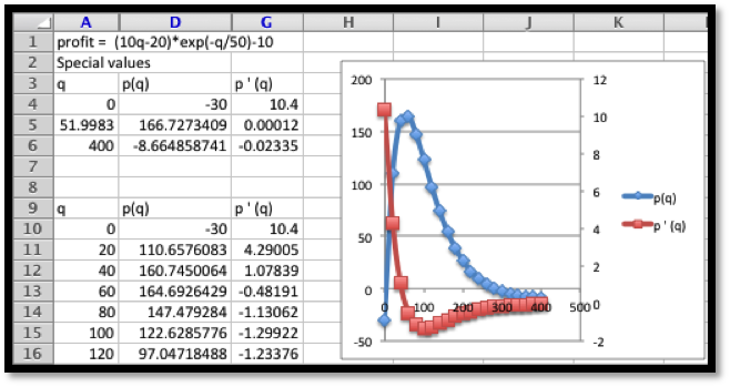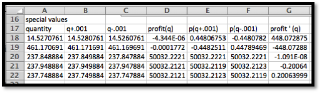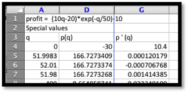 I now set up the table for special values with goal seek. I use starting points of 20 and 450 for the break even points and 250 for the maximum. To find break even points, I goal seek on the profit function. To find the maximum point, I goal seek on the derivative of the profit function.