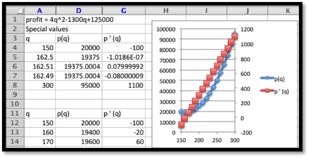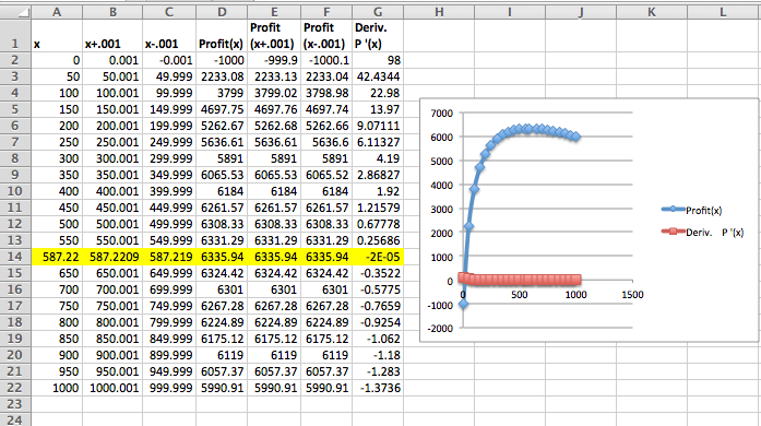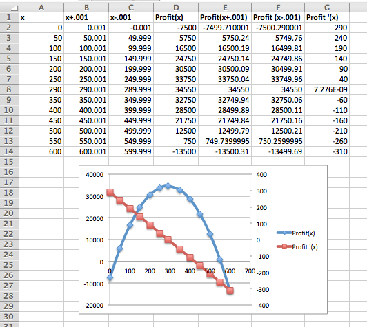 We find profit and the derivative of the profit function to determine where the derivative is 0. Below is the graph of \(\profit, \profit'\) and we did GoalSeek to find the critical point (x=290). We should also consider endpoints, but the vertex is clearly above 0.