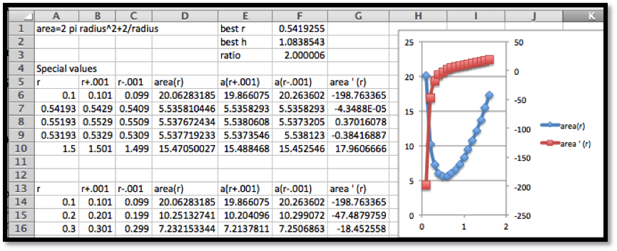 There are three technical details worth mentioning from the last example. First, in Excel, the best way to put \(\pi\) in a formula is with the constant PI(). Second, the function for area is defined on an open interval where the radius is positive. There is no maximum area for a can of fixed volume. (However inefficient our can is, we can always make it worse, by moving farther from the optimum.) Third, one should also note that for this problem, we wanted several numbers as part of our answer. The worksheet for the problem puts the best height and radius at the top, where the reader can easily find it.