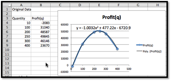 From looking at a quick plot of the data, I am going to assume that the profit function is a downward facing parabola, so I find the best fitting quadratic polynomial for the data. Using trendlines, my profit function is