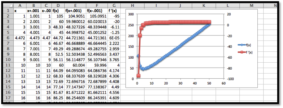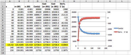 The function is graphed for \(0\le q\le 150\) in steps of 10. The cost function almost looks as though it is leveling out and reaching an asymptote. An inspection of the table shows that this is not true. The derivative goes from negative to positive right around 130. GoalSeek shows that the derivative is zero at approximately 131.42. The recorded Cost is $12,728.40, which is the minimal cost for this function.