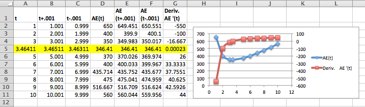 I create a spreadsheet that calculates the cost and its derivative over the first 10 years.