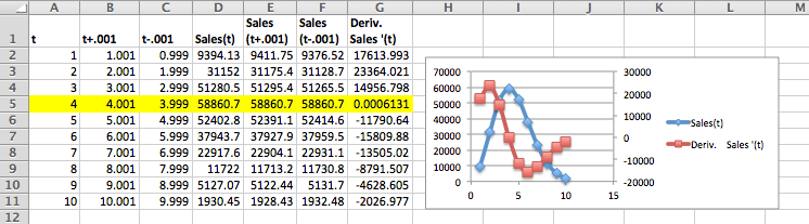 GoalSeek does not improve our estimate, and we see that the maximum sales must occur when \(t = 4\text{.}\) The derivative is (close to) 0 there and this means our sales are maximized in April (assuming 1 represents January).