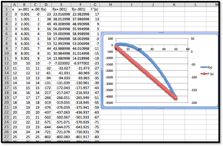 We create columns for \(x, x+.001, x-.001, f(x), f(x+.001), f(x-.001)\text{,}\)and \(f'(x)\)