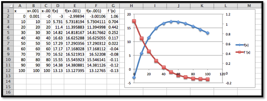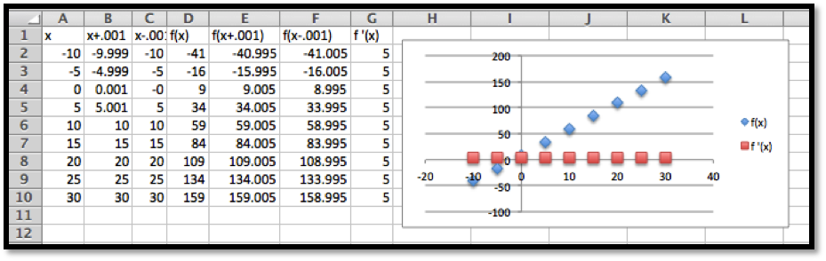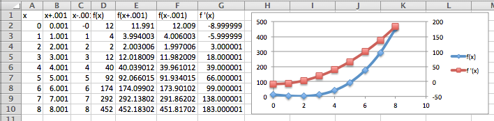 Once you enter \(f(x)\text{,}\) doing a right quick fill easily finds \(f(x+.001)\) and \(f(x-.001)\text{,}\) and then \(f'(x)\) is easy to compute.