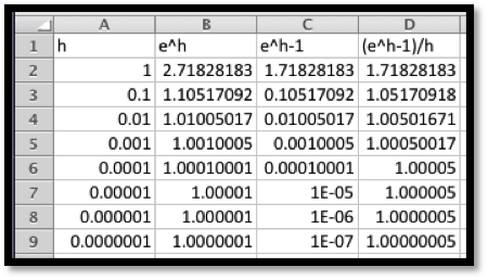 It seems clear that \(\lim_{h\to0}\frac{e^h-1}{h} =1\text{.}\)