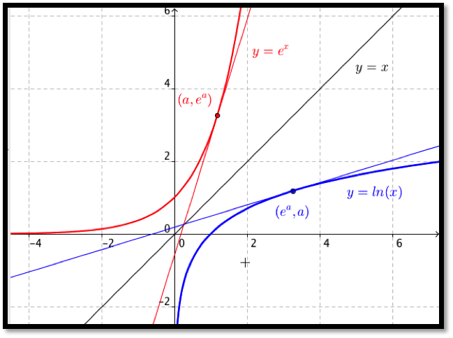 The slope of the tangent line at \((a,e^a)\) is \(e^a\) by the exponential rule. Symmetry tells us the slope of the line tangent to \(y=\ln(x)\) at \((e^a,a)\) is \(1/e^a\text{.}\) Letting \(b=e^a\text{,}\) the slope of the line tangent to \(y=\ln(x)\) at \((b,\ln(b))\) is \(1/b\text{.}\) Thus \(\frac{d}{dx}(\ln(x))=1/x\text{.}\)