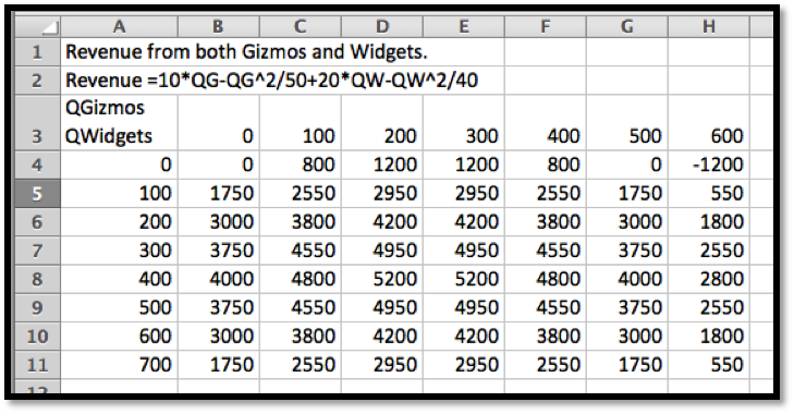I have a company that produces two products, widgets and gizmos. The two demand functions are: