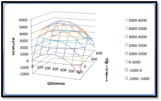 Thus, when we treat either QW or QG as a constant we effectively are looking at one of the wires of the wire frame. To illustrate this, we will look at the wires corresponding to \(\QW=400\) and \(\QG=300\text{.}\) When \(\QG=300\text{,}\) our revenue function simplifies to