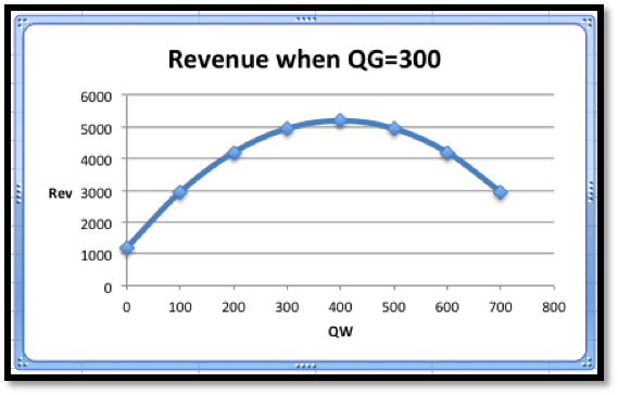 Look at the functions of one variable obtained by treating either QG or QW as a constant. Use this information to find where we maximize revenue.