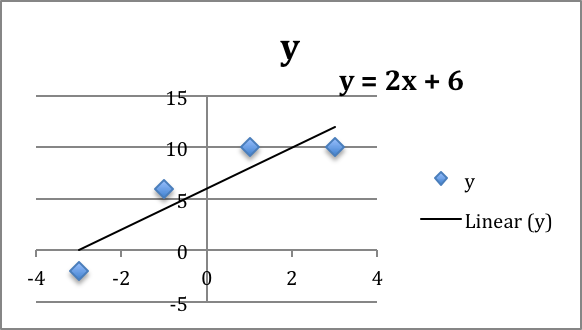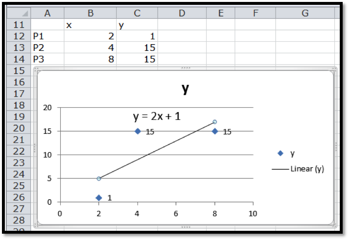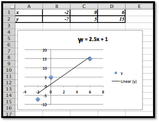 We start by making a table adding a scatterplot and adding a trendline to the graph. We remember to select the option to make the formula visible. The trendline command tells us the slope should be 2 and the intercept should be 1.