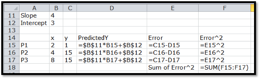 We need to add the predicting equation to use solver . We start with a randomly chosen slope and intercept for our prediction line. Our table has a PredictedY column, which gives the value that would be on the line with our slope and intercept. We add in the error, which is the difference between the predicted y and the actual y, and the square of the error. We then take the sum of the squares of the errors.